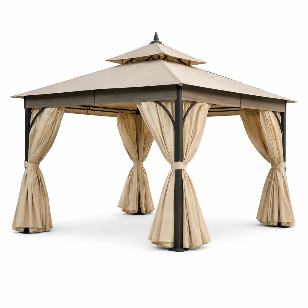 Gazebo de jardín de aluminio con techo de acero y cortinas de poliéster beige